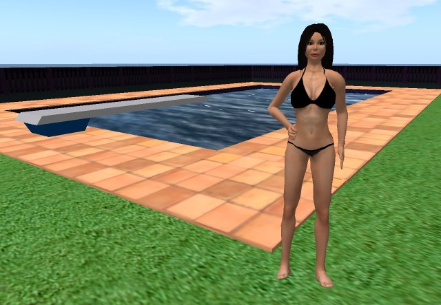 So, I thought I’d tell you some of the secrets to making some of the pictures. The primary new feature of swimming is a one lap underwater swimming race. One picture I needed was Ariane tagging the pool wall. Above is a break down of the steps involved: 1.) Take a screen capture of the Open Sim at the location Ariane would be tagging the wall. 2.) Create the tagging pose (I actually used a “spider-man” pose from my pose library and adjusted it as needed) and build a set of white walls to stand in for the pool. 3.) Render a “shadow” from available lighting. Backyard pools commonly have underwater lights on the pool walls. She is too close to the right wall to get light from there, so the lighting is coming from light on the left wall. 4.) Render Ariane without the walls or shadows.