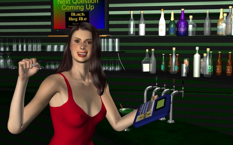 This picture, from the new bar set, takes the original 3D file, with poses and props, and moves it into a new 3D set.  In the original bar scene, I just used a single flat game screenshot for every single bar scene image.  Now with a 3D set, I can give all the pictures new angles and play with the lighting some more.