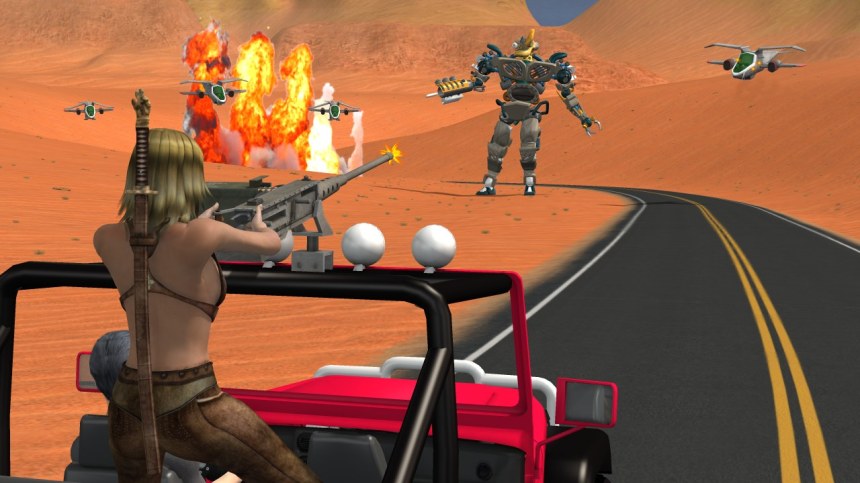 The action movie and romantic comedy consist of 3 screens each, act 1, act 2, and act 3.  So basically I am reducing a 2 hour movie to a 3 panel comic strip and finding it very easy to do.  The title of the generic action movie is “The Maguffin Job 2 in 3D”, and basically consists of picture 1: a gathering, picture 2: the conflict begins, picture 3: the conflict ends. This is picture #3.  In creating these pictures, I am making use of every model I can find in my poser library.  The giant robot, the drone planes, and the machine gun are all freebies that came with either Poser 5 or 7, I forgot.  The road is the model I used for the new trip to the look put point in the dating game, I am just reusing it.  The girl is a flawed character I got cheap, and the guy doing the driving is the generic “Michael 4” which I decided I would need later on, and DAZ was selling it this week at half price. The “jeep” I assume you recognize if you played the Dating Simulator