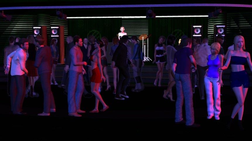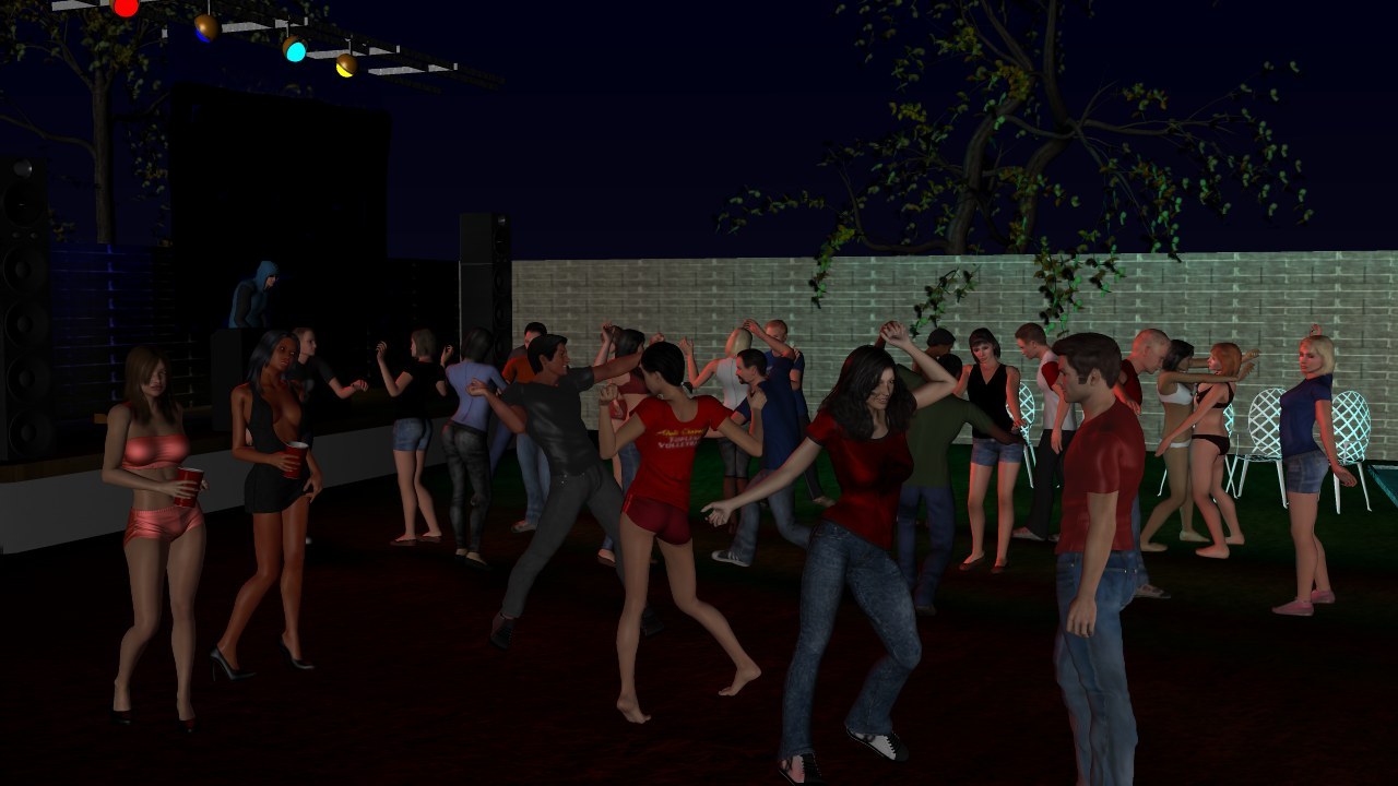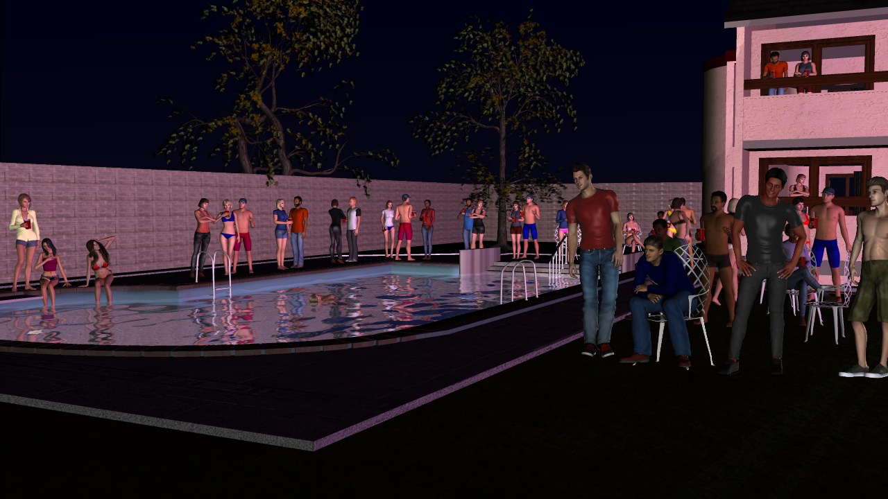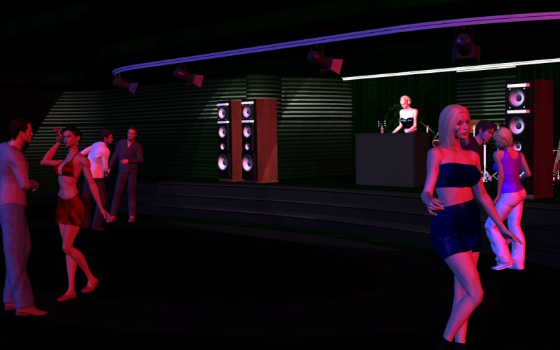 I also wanted a dance crowd where everyone is actually dancing. The solution is to use low rez male and female characters. While I can only manage 5 high res characters in a scene at a time, I can easily manage 30 low res characters in a scene at a time. They can do pretty much everything that high res characters can do except look good close up, so I throw some high res people into the foreground to make the crowd look better. There are some major flaws with these low res characters, especially the females. Someone decided to add ambient lighting to the skin to make them look better in daytime, but my crowd scenes are set at night, and it took a bit of effort to get rid of that ambient lighting (hint: pp2 files which tell how to texture and light characters are just text files that you can manipulate in Notepad using find and replace.)