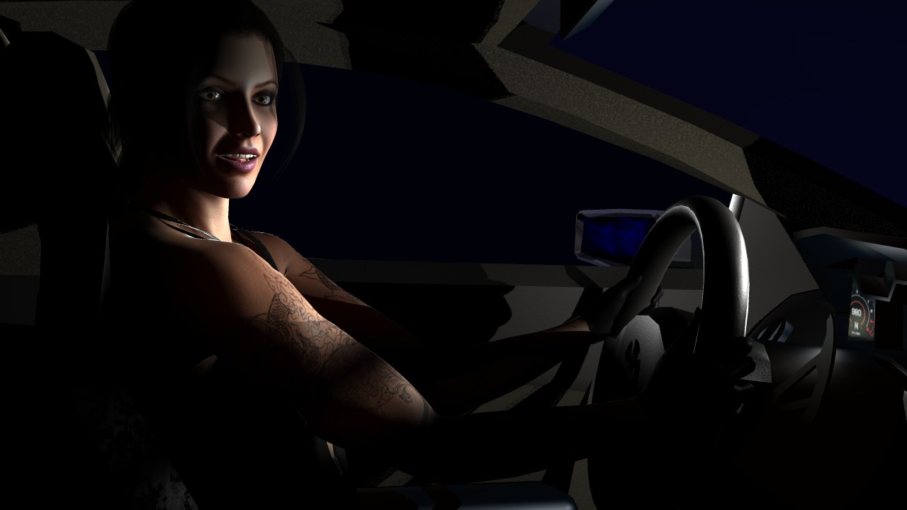 Let’s talk about Veronica.  She is the token “bad girl”. Because I have had my car stolen by kids so they can go on joy rides, ultimately getting my car back a few days later when the cops find it abandoned somewhere, the idea of a car thief seemed pretty evil to me.  My original model design was very simple: This Assassin Angel character at DAZ seemed the obvious choice, especially due to her resemblance to Angelina Jolie in Gone in 60 Seconds.  Eventually, I decided the resemblance to Angelina Jolie to be too distracting, and went with Jordana Brewster from The Fast and The Furious films. (Just kidding, I went with a generic female head), but I kept the sexy leather outfit and the tattooed skin.