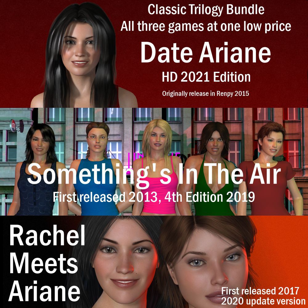Currently, there are four products available in the official Website Store where there used to be five. Because classic Date Ariane is still popular despite it’s imminent replacement, I decided to add it to the Something’s In The Air and Rachel Meets Ariane bundle to create the Date Ariane Classic Trilogy bundle priced at $5 for all three games. Since Date Ariane was $5 all by itself, and the other two cost $5 as a set. That’s basically half off.