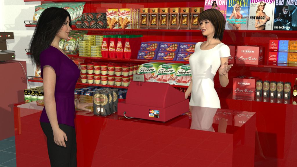 The above image from a convenient store is just such a change. Since DAR’s release I created new covers to Beach and Hooboy magazines, and I decided that store clerks should wear white instead of red, because red shirts blend too much with the store decor. I’ve also made updates to the decor in the Drive-N-Dine since the images on the wall are 14 years old and definitely looked like it, and since the other 3 games have updated the flash forwards after drinking absinthe should reflect the new looks of the games they are supposed to represent. This update was done now because I just updated the scene in Something’s In the Air Redux that is referenced in Date Ariane Remastered.