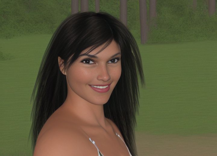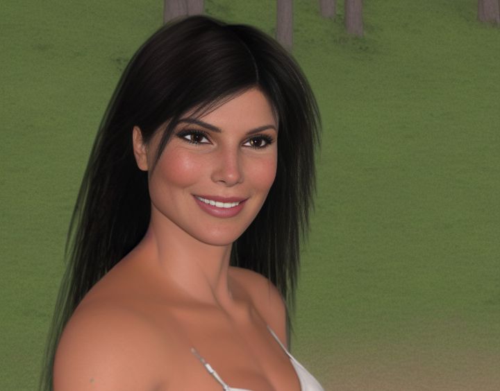 At this point you start experimenting, trying more precise prompts, try different language tricks. The “Img2Img” tool allows you to take the generated image above and zoom in on one of the women, and type a more precise prompt like “Sandra Bullock with black hair and big brown eyes walking in a forest away from a waterfall”