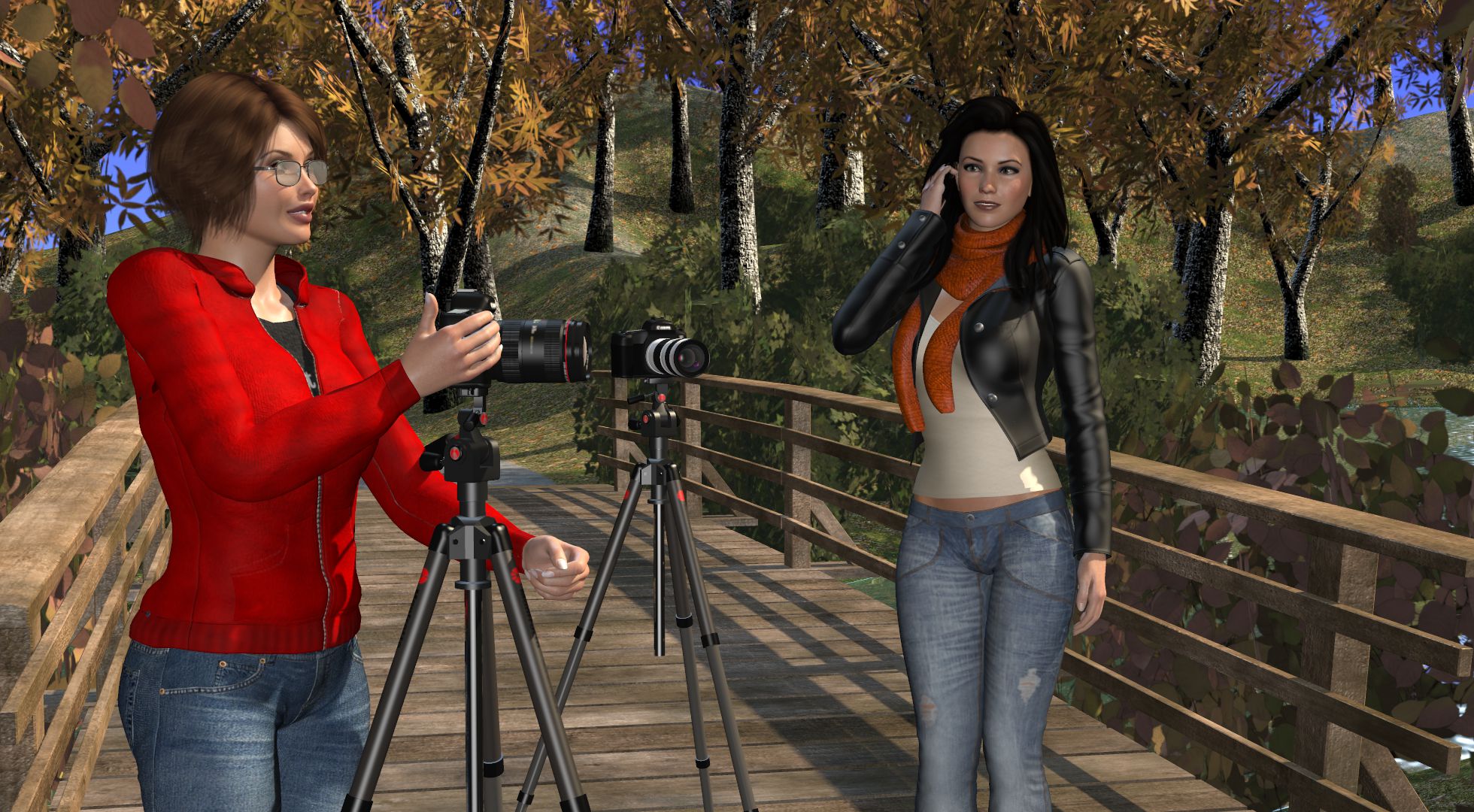 “Let me get some test shots,” suggests Rachel. “You’ll need to stand in the middle of the bridge near the rail, Feel free to sit on the rail if you want.”
